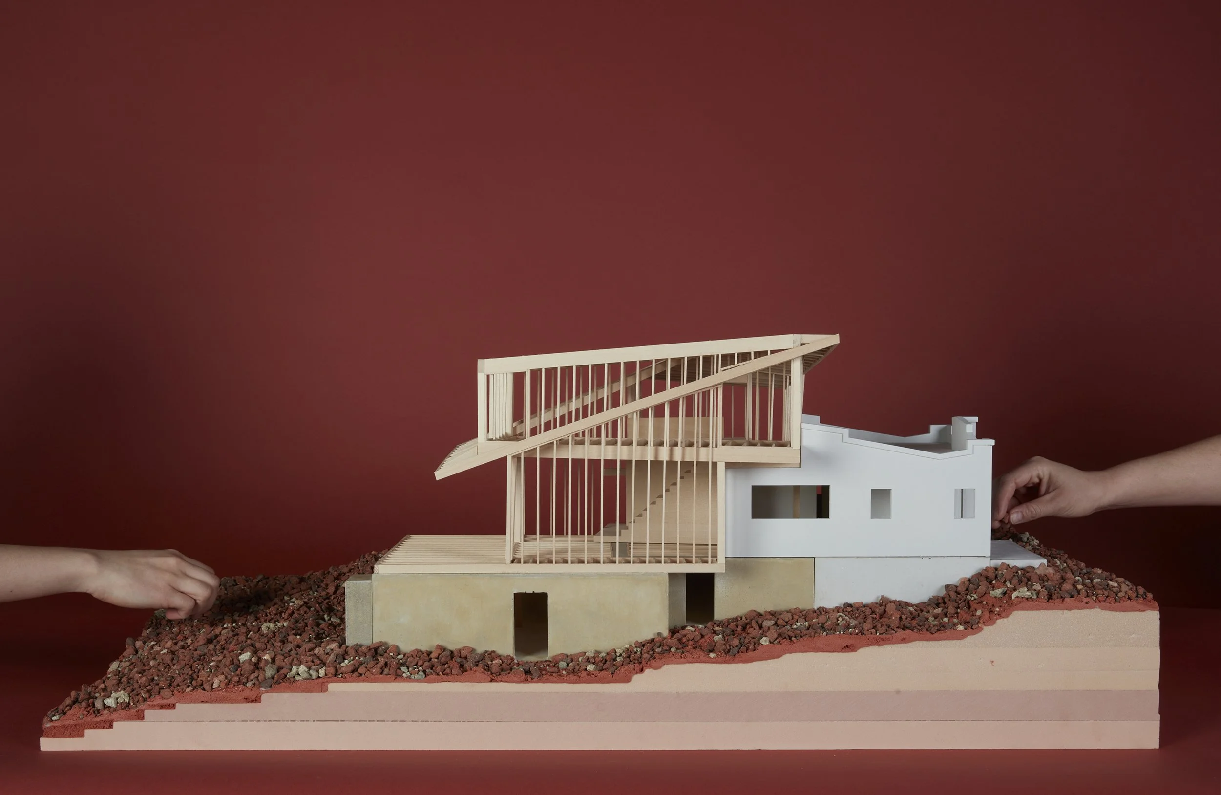 Rough House is a large addition to a two-bedroom bungalow on a steep and narrow hillside lot in Echo Park. The three-story addition comprises an ADU, an extended kitchen and patio, a family room, and primary suite. Maintaining the terracing logic of the site, the new mass stacks and twists to allow continued connection with the site and views. Crouching beneath a deep overhang, the project mobilizes the ubiquitous language of the Craftsman roof and dormer to minimize the appearance on the site. Working within the Los Angeles residential material palate, the design deploys both rough and smooth material articulation to unravel and explore the seams between the high and the low, the found and the new, the everyday and the rarified, to find a new attitude of these forms and materials.