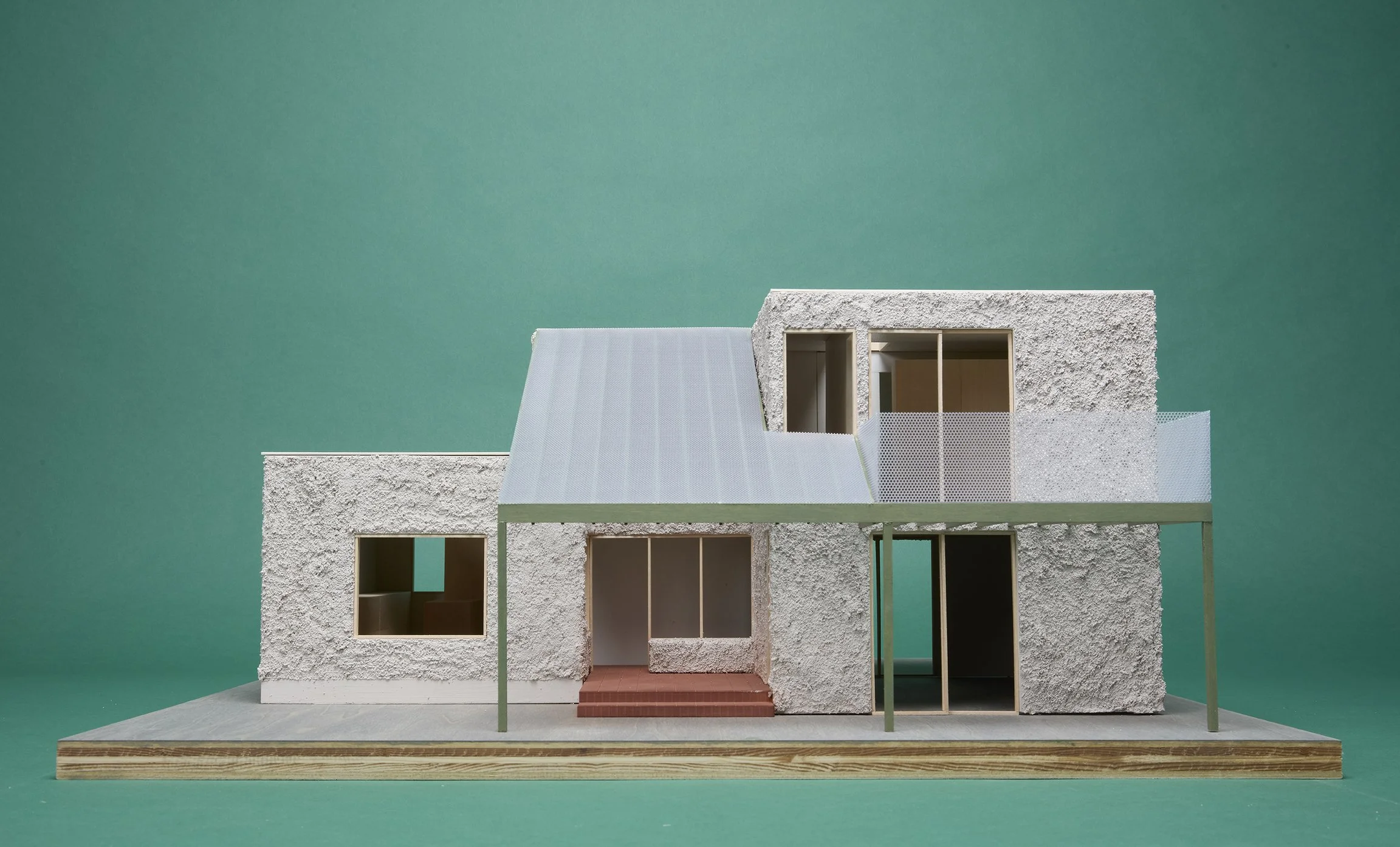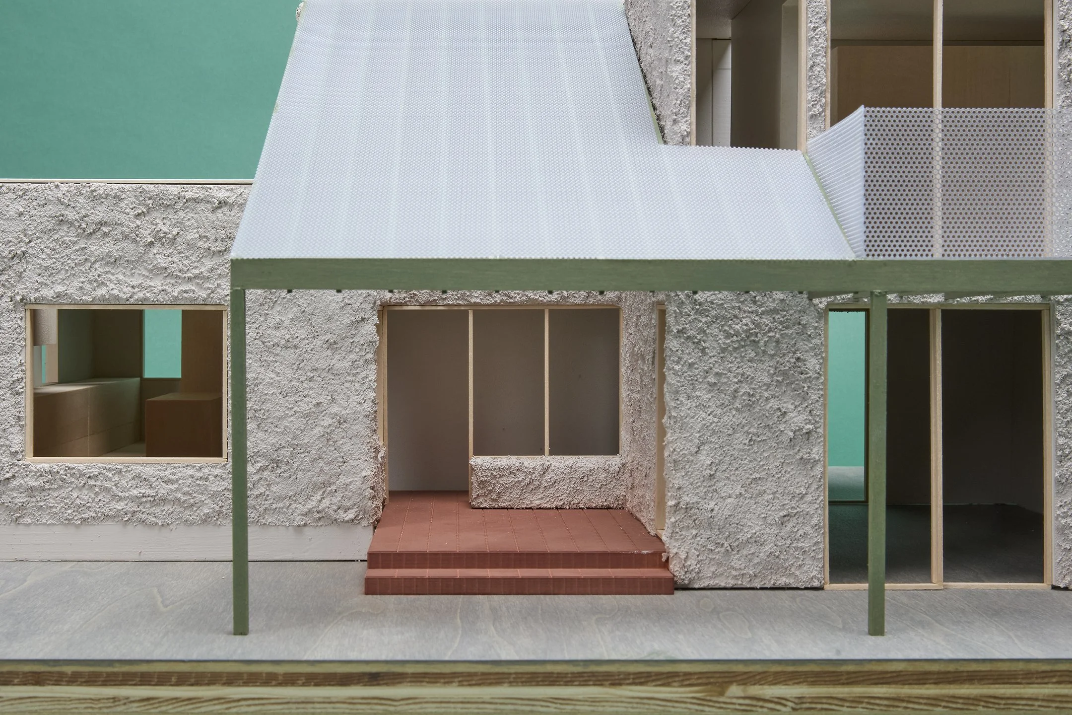 Thin perforated metal sheeting forms the roof and balcony guardrail, creating a lenticular effect—appearing solid from a distance and porous up close. This dual reading lends mass and lightness to the home’s modest, straightforward form.